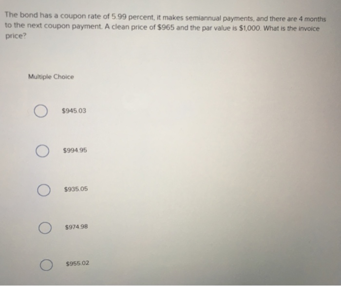 Coupon Bond Formula | Examples with Excel Template - EDUCBA Coupon Bond = $25 * [1 - (1 + 4.5%/2)-16] + [$1000 / (1 + 4.5%/2) 16; Coupon Bond = $1,033; Therefore, the current market price of each coupon bond is $1,033, which means it is currently traded at a premium (current market price higher than par value). Explanation. The formula for coupon bond can be derived by using the following steps: