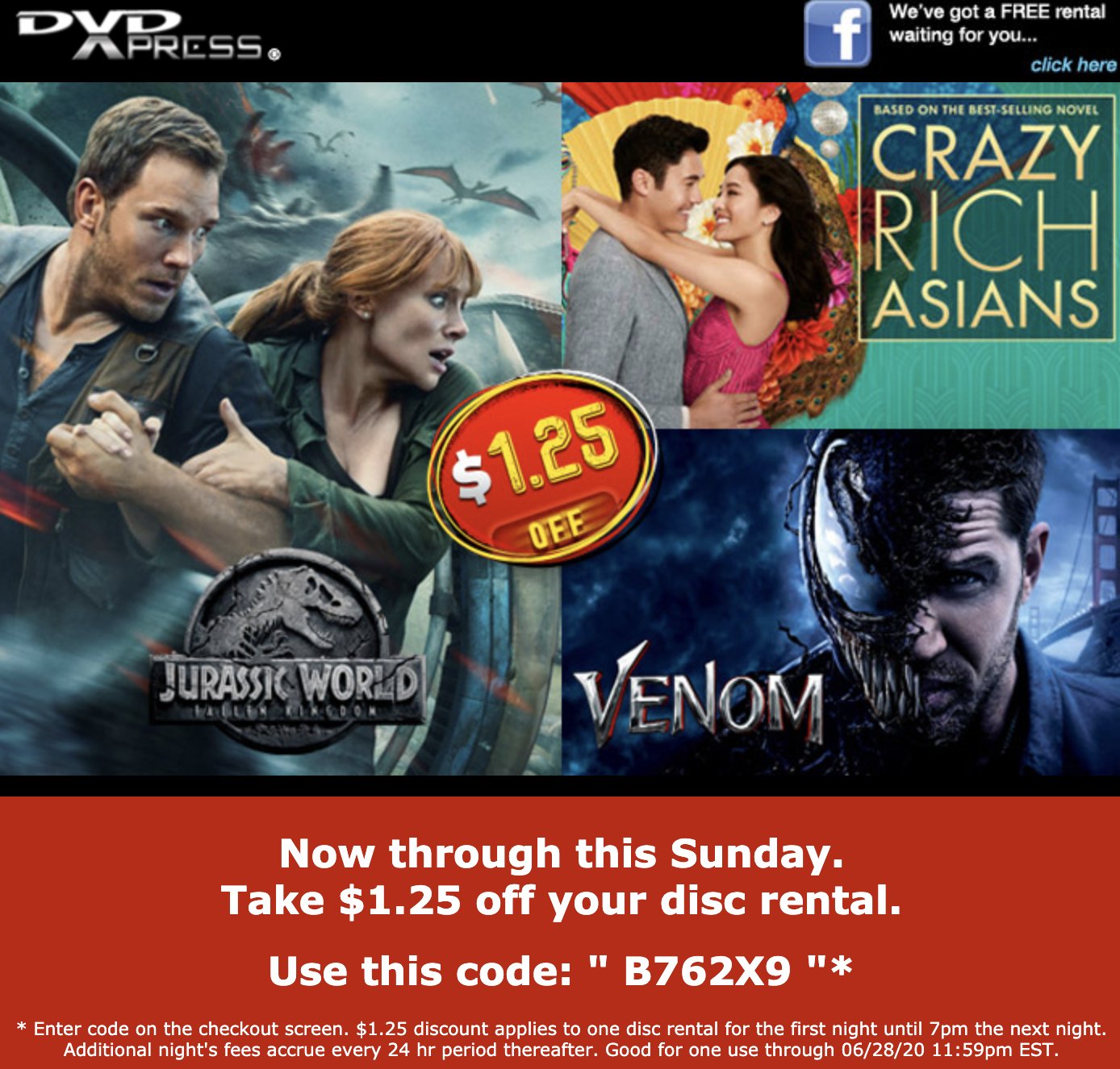 DVDXpress, Inc. Coupons & Promo Codes - Ultimate Coupons.com 1 Free Rental Ongoing Discount 90% Success VIEW CODE Rent 1, Get 1 Free (add 2 movies to shopping cart) Ongoing Discount 95% Success VIEW CODE Buy , get free Ongoing Discount 93% Success VIEW CODE Free Rental Ongoing Discount 82% Success VIEW CODE Similar Stores Go to DVDXpress, Inc. All DVDXpress, Inc. offers curated by: UltimateCoupons