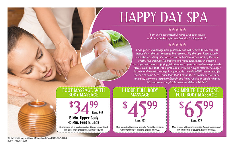 Foot Massage with Body Massage $35.99-Happy Day Spa Natomas Foot Massage with Body Massage $35.99-Happy Day Spa Natomas Current Offers Foot Massage With Body Massage $35.99 (Reg. $45) One hour session. Natomas location only. For More Information: 3890 Truxel Rd. Ste. 100 916 550-1541 6911 Stockton Blvd. Ste. 500 916 428-8880 Expires 11/30/2022 Coupon ID: 1541 Print This Coupon